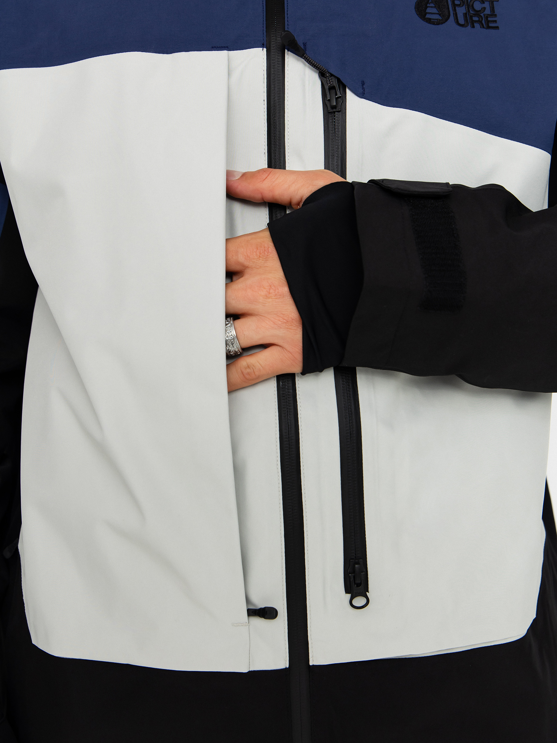 • Taschen: Brusttasche mit YKK® Reißverschluss, Seitentasche mit verdecktem Reißverschluss, Innentasche und Netztasche