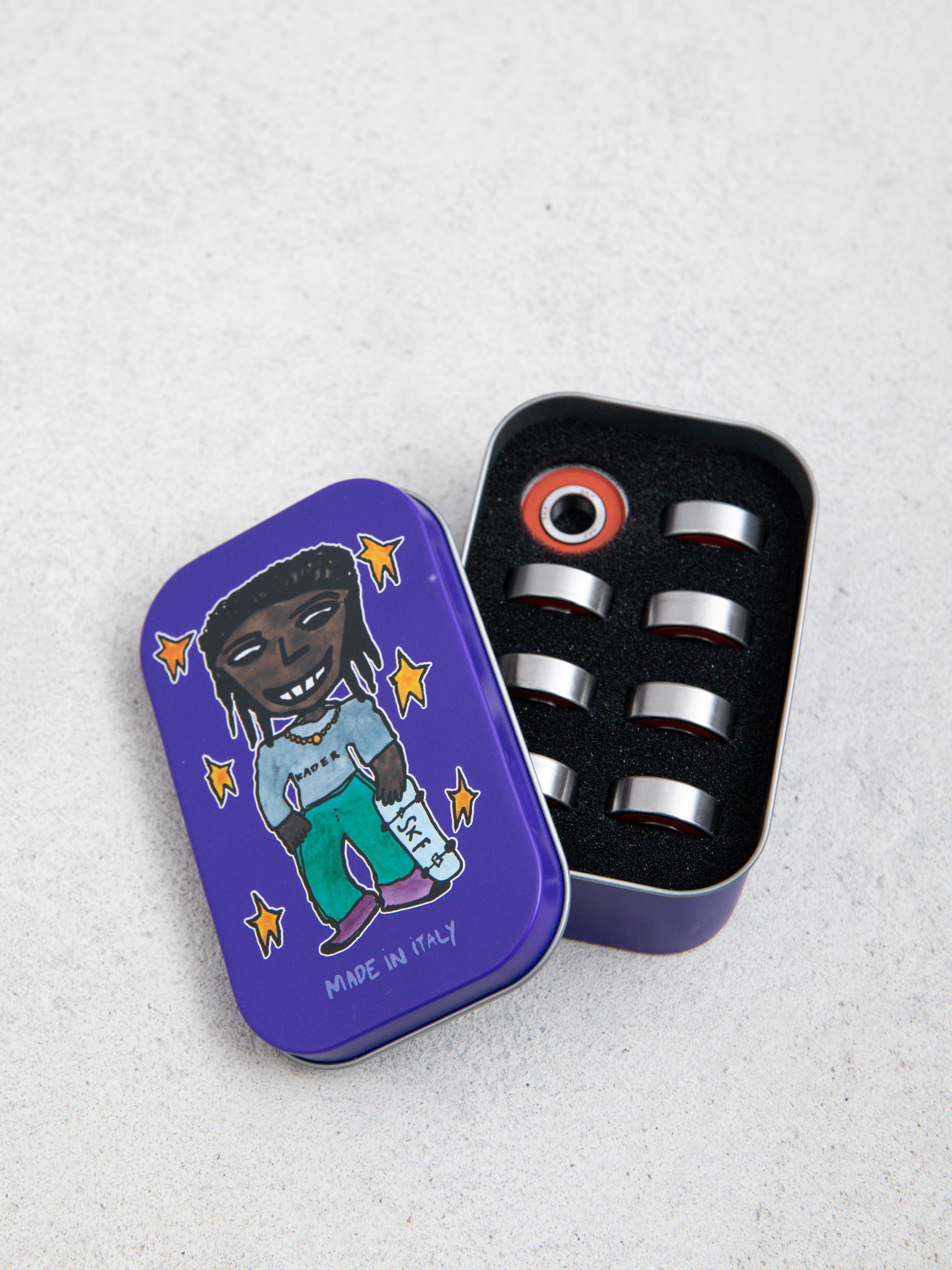 • SKF Kader Sylla Signature Bearings are a board-tested steel set designed for a smooth and precise ride. Pre-oiled steel balls ensure durability and performance, while laser engraving on the outer ring highlights the unique character of the model. The set includes 8 bearings with rubber covers, packaged in a metal box.