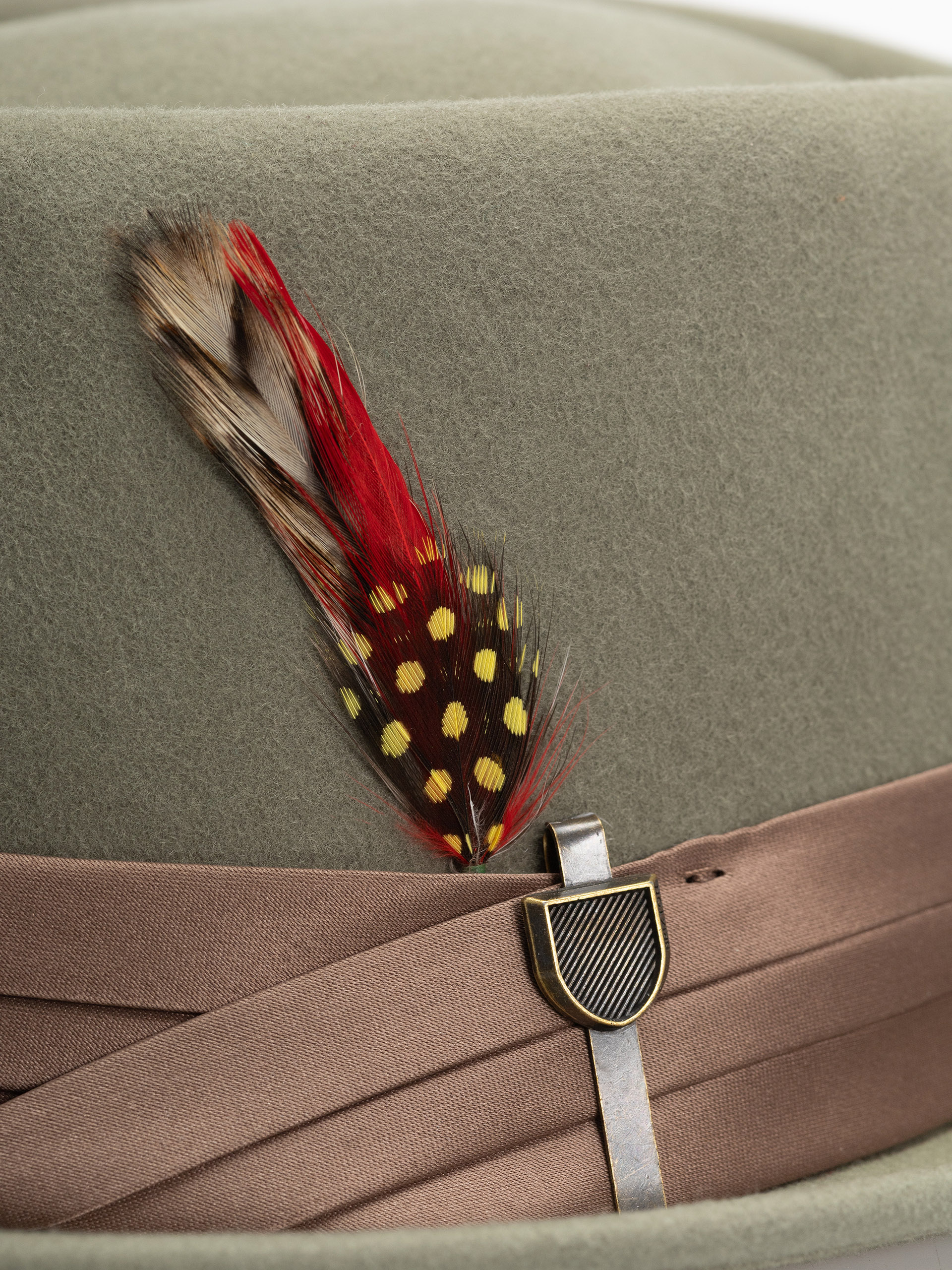 • Brixton Stout Pork Pie is an elegant felt hat with a short brim decorated with a satin band, feathers and a metal pin with an engraved Brixton logo